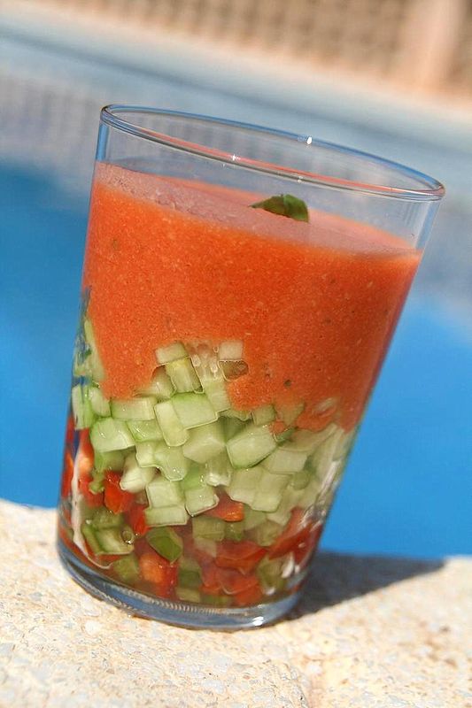 4. Dans des grands verres, mettre au fond les dés de poivrons, puis les dés de concombre. Recouvrir de gaspacho et laisser au réfrigérateur pendant 30 minutes.
