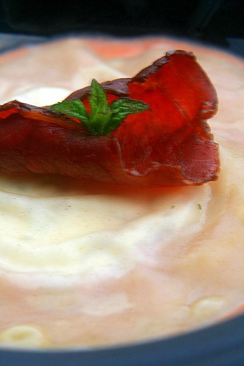 6. Dans une assiette de service, disposer la sauce tomate puis recouvrir des ravioles. Décorer avec une tranche de bacon grillée.