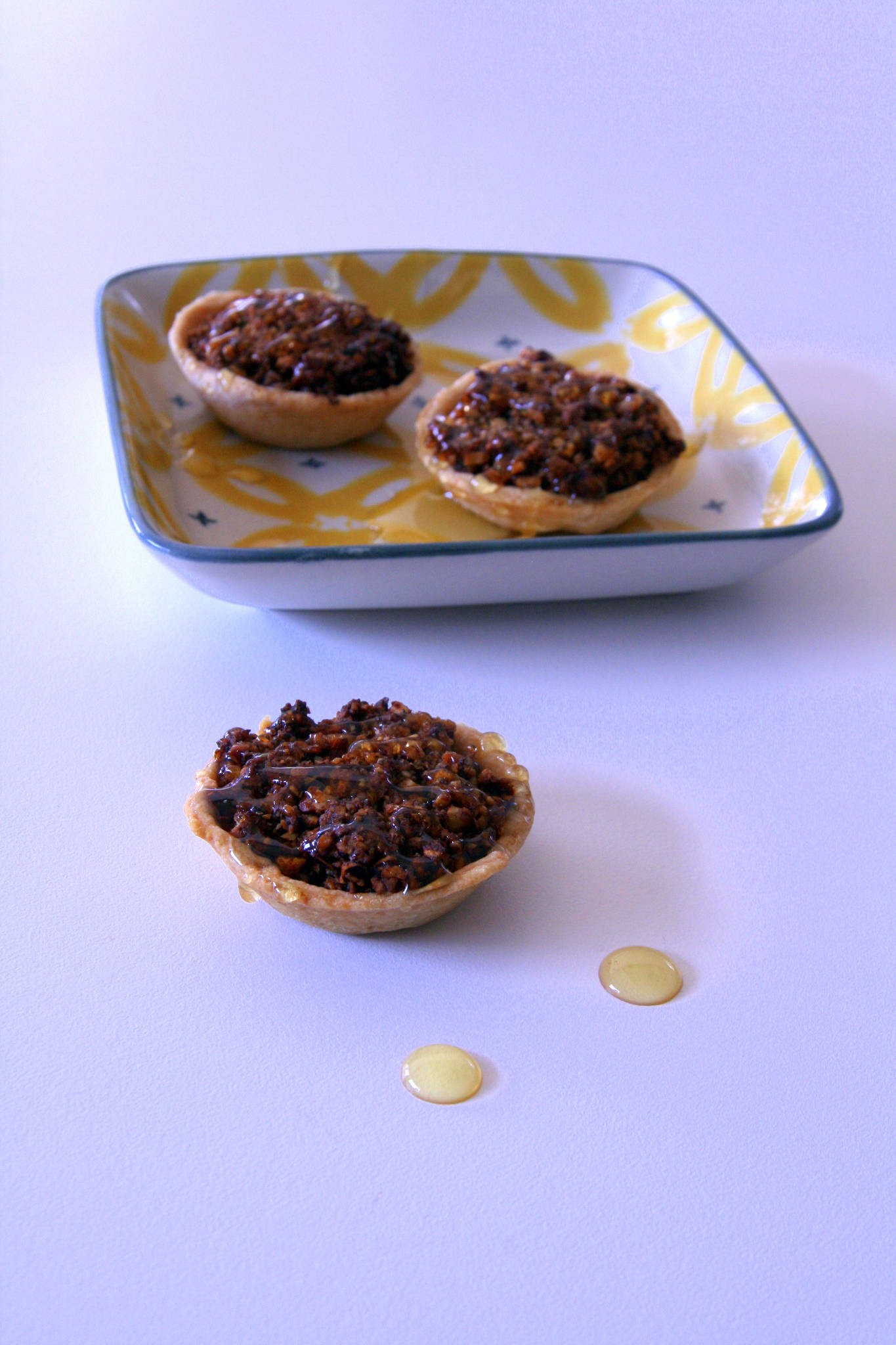 - Mixer les noix de pécan avec 20 g de miel de thym et la fleur de sel. Répartir sur les poires dans les fonds de tartelettes.