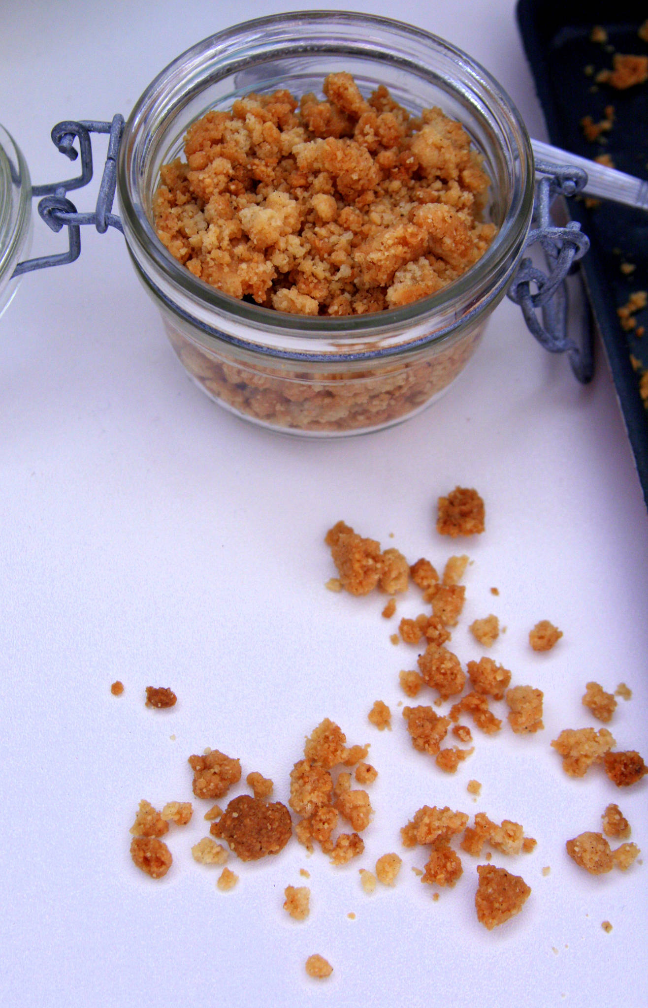 - Répartir la pâte à crumble sur une tôle et faire cuire au four pendant 6 à 7 minutes. Au moyen de deux grandes cuillères, mélanger le crumble afin de retourner la pâte, puis cuire de nouveau 2 à 3 minutes.