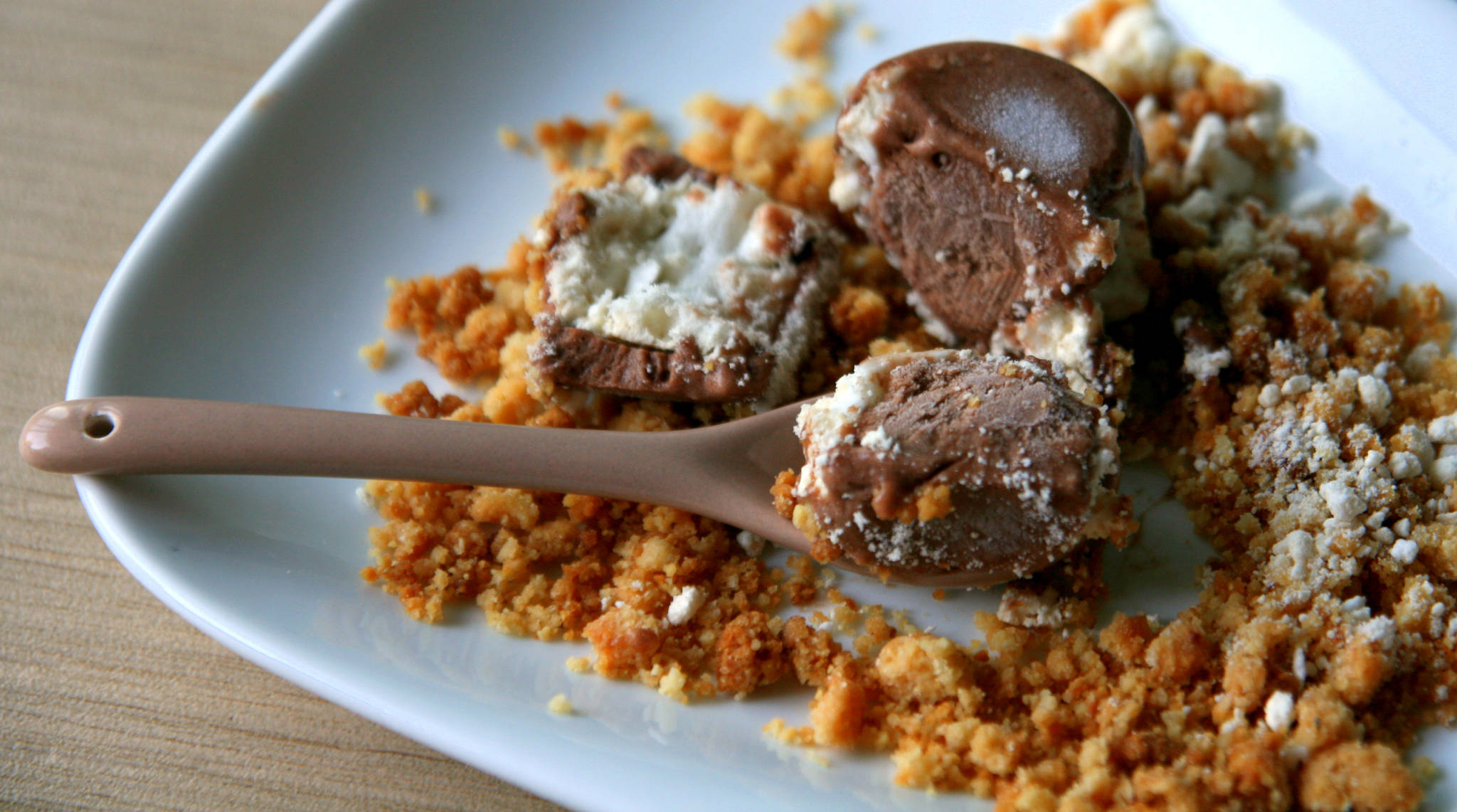 Entremets glacé aux haricots de Soissons, cacao & whisky, cœur de meringue, crumble à la muscade