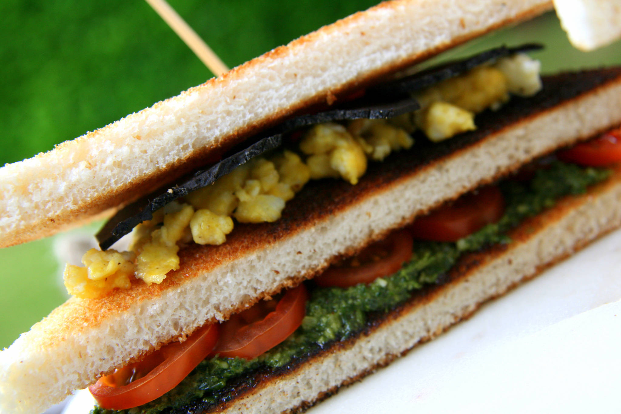 Club-sandwich brouillade d’œufs aux truffes, pesto de fanes de carottes et tomates-cerises