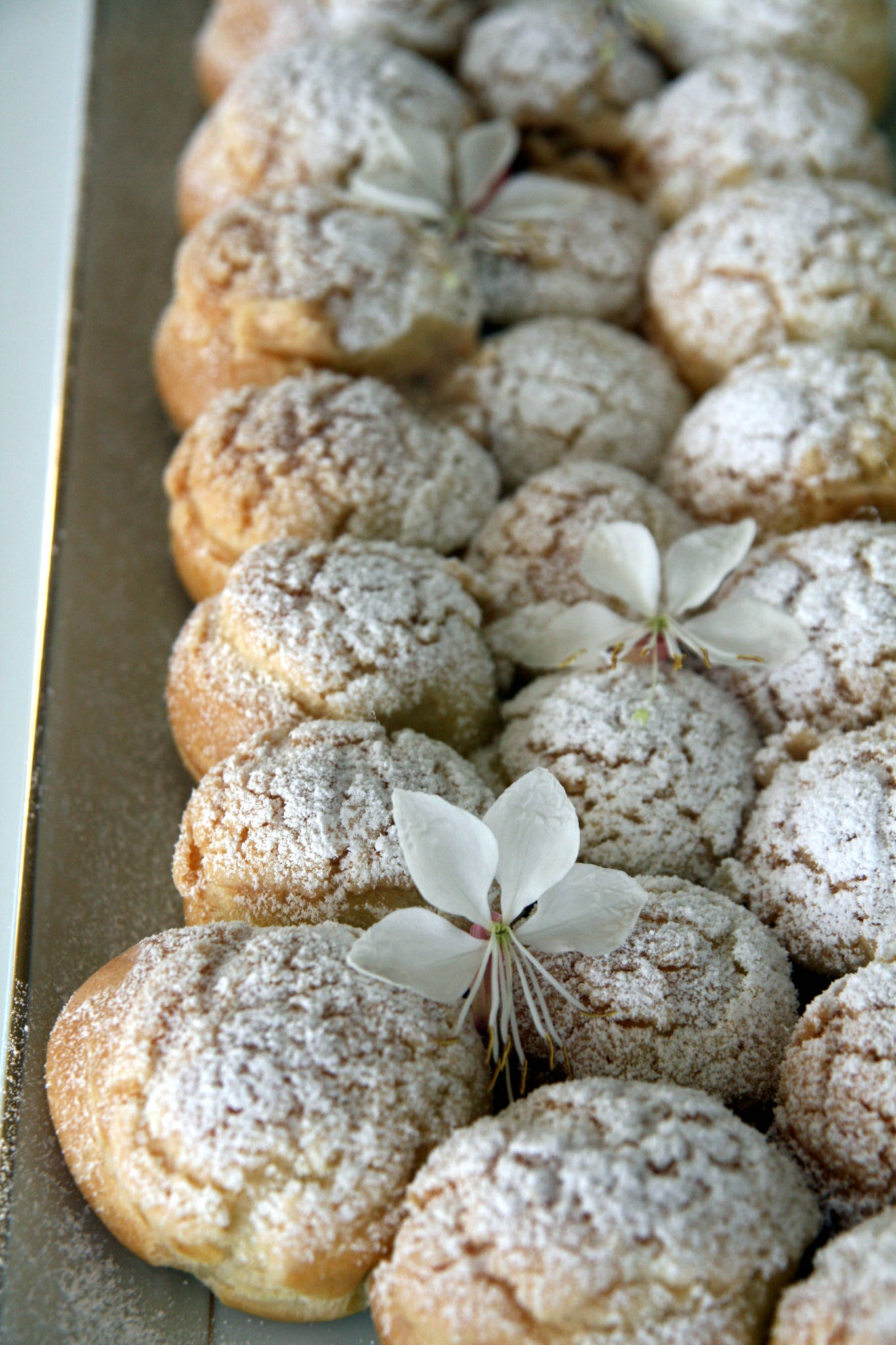- Préparer la pâte à choux : préchauffer le four à 180°C. Dans une casserole, mettre l’eau, le beurre coupé en morceaux, le sucre et le sel. Mettre sur feu moyen, porter à ébullition. Hors du feu, ajouter la farine en une seule fois, et remuer vivement avec une cuillère de bois. Remettre sur le feu et cuire 5 à 6 minutes sans cesser de remuer : la pâte doit se détacher des parois de la casserole. Retirer du feu, laisser refroidir quelques minutes. Ajouter ensuite les œufs entiers un à un, en remuant bien entre chaque œuf pour qu’il soit bien intégré à la préparation. Mettre la préparation dans une poche à douille, et faire des petits tas sur une plaque anti-adhésive.