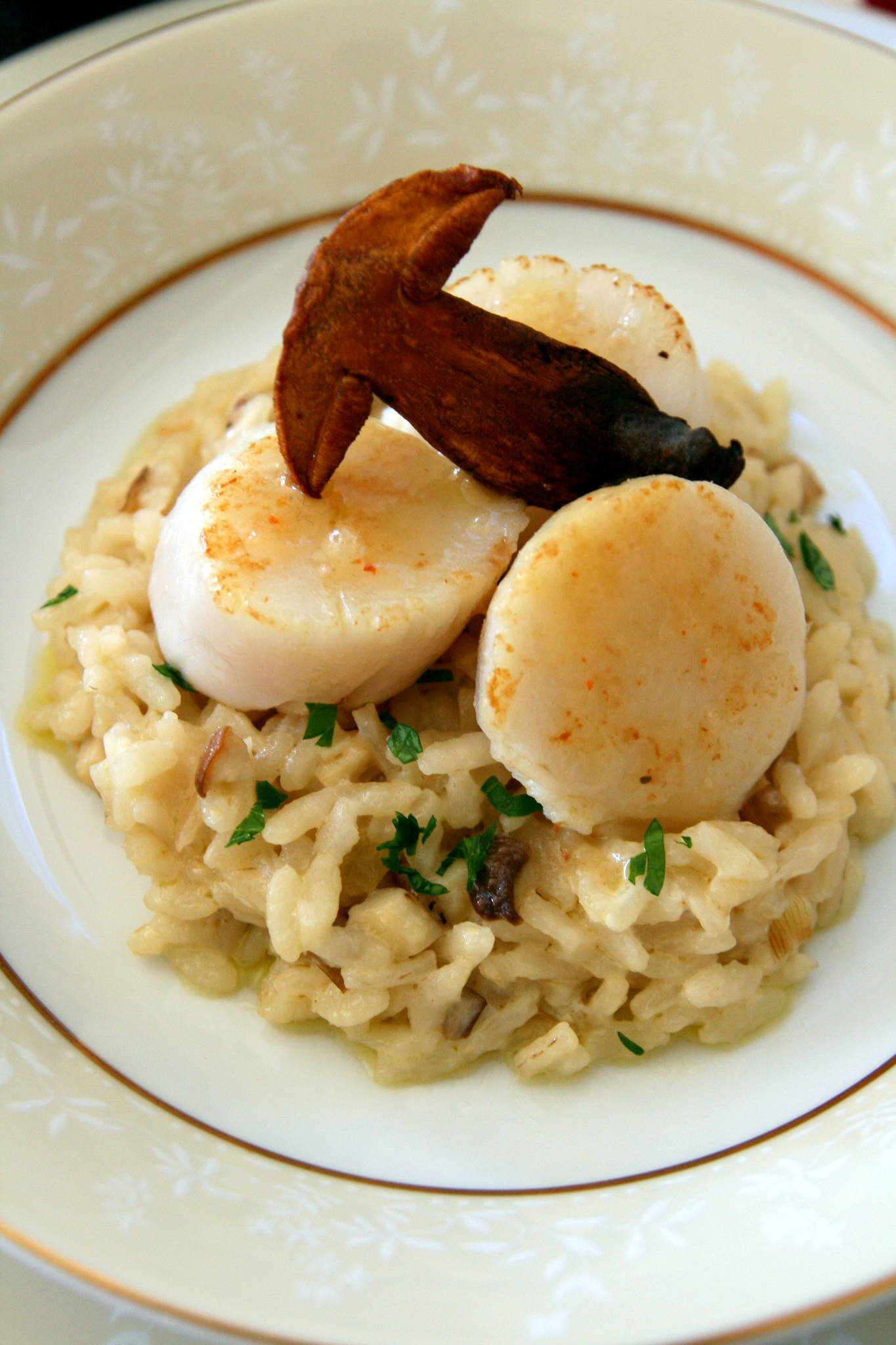 - Procéder au dressage : dans une assiette creuse, déposer le risotto. Ajouter les noix de Saint-Jacques, les recouvrir d’un peu de bisque. Ajouter la chips de cèpe et servir.