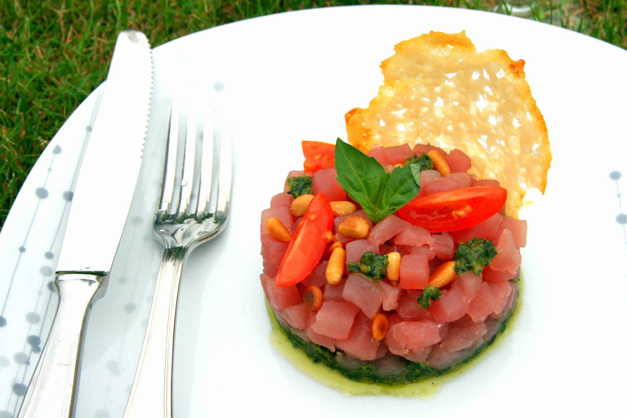 Tartare de thon à l'italienne, pesto maison, tuile de parmesan, Château Tour de Bonnet blanc 2020